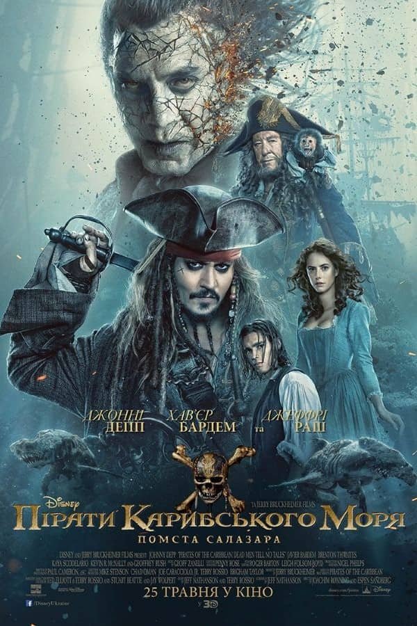 Фільм п'ятий. Капітан Джек Горобець, який вичерпав свою удачу, виявляє, що за ним полює його старий ворог, жахливий капітан Салазар і його примарні пірати. Вони щойно втекли з Диявольського трикутника і мають намір знищити всіх піратів, включно з Джеком. Допоможе врятуватися лише могутній артефакт - тризуб Посейдона, який дарує своєму власникові повний контроль над морями.
